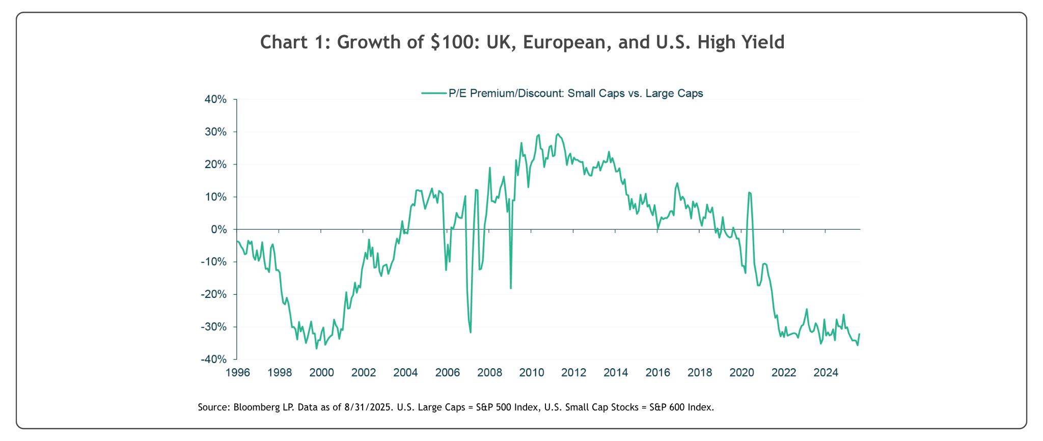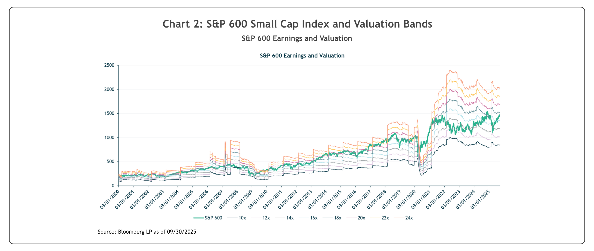 The S&P 600 Small Cap Index, which focuses on profitable small-cap firms, traded at a trailing P/E ratio of 15.9 as of 30 September 2025, slightly above its 10-year average of 14.5 but within one standard deviation (13.0-16.0). This compares favourably to its five-year average of 14.8, reflecting recovery from 2020’s earnings distortions. Chart 2 shows how the S&P 600 Small Index is trading near its long-term average, midway between extreme high and low valuations.