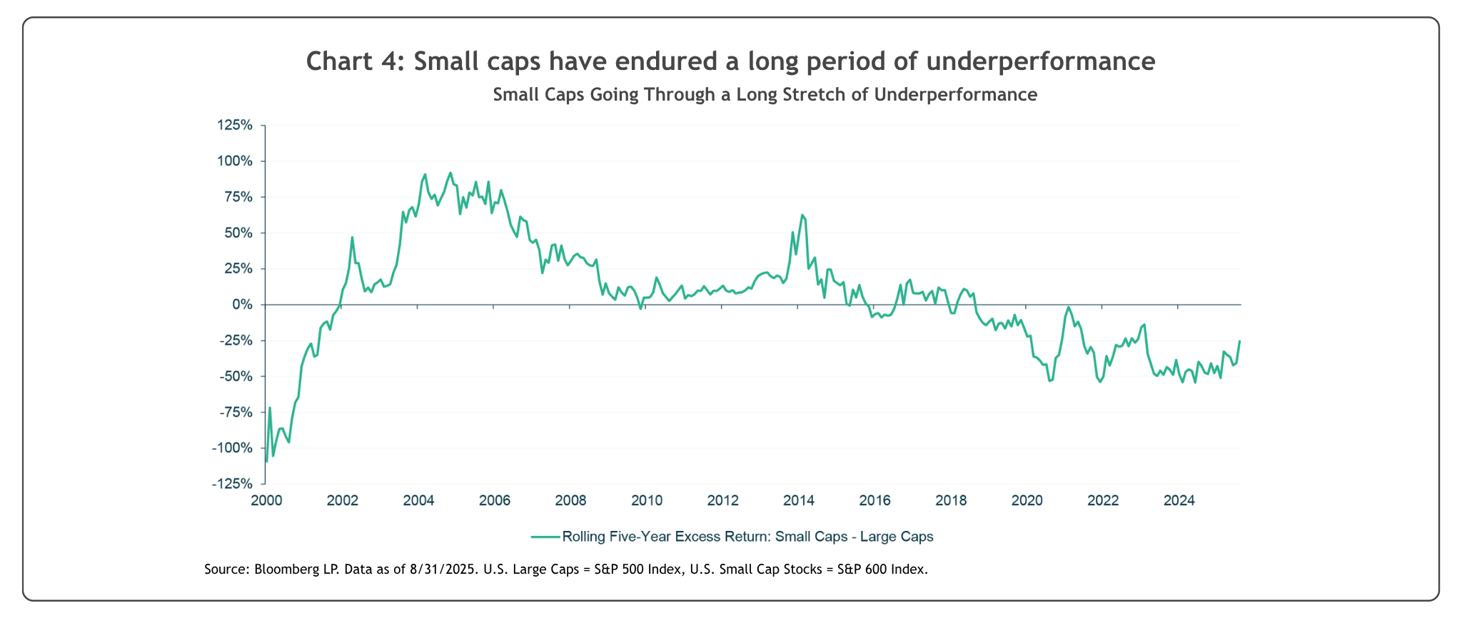 The S&P 600’s year-to-date net total return as of 30 September is approximately 4.2% in USD terms, following gains of 8.7% in 2024 and 16.1% in 2023. However, as chart 4 shows, smaller companies have significantly trailed their larger-cap peers for nearly two decades, a situation that has rarely persisted over longer time periods.
