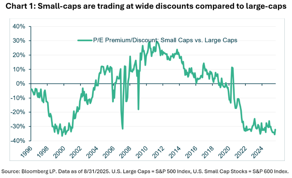 The US equity market continues to exhibit a tale of two parts: the mega-cap driven S&P 500, propelled by AI enthusiasm and global reach, versus the more domestically oriented small- and medium-cap universes, represented by the S&P 600 Small Cap and S&P 400 Mid Cap indices.
