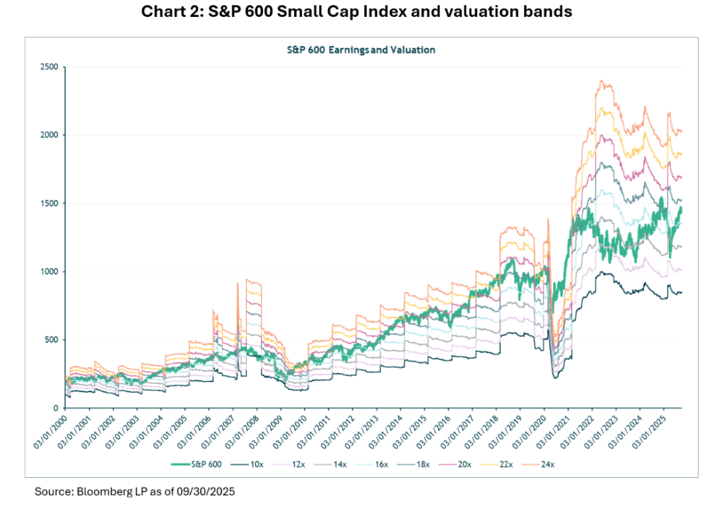 The S&P 600 Small Cap Index, which focuses on profitable small-cap firms, traded at a trailing P/E ratio of 15.9 as of 30 September 2025, slightly above its 10-year average of 14.5 but within one standard deviation (13.0-16.0). This compares favourably to its five-year average of 14.8, reflecting recovery from 2020’s earnings distortions. Chart 2 shows how the S&P 600 Small Index is trading near its long-term average, midway between extreme high and low valuations.