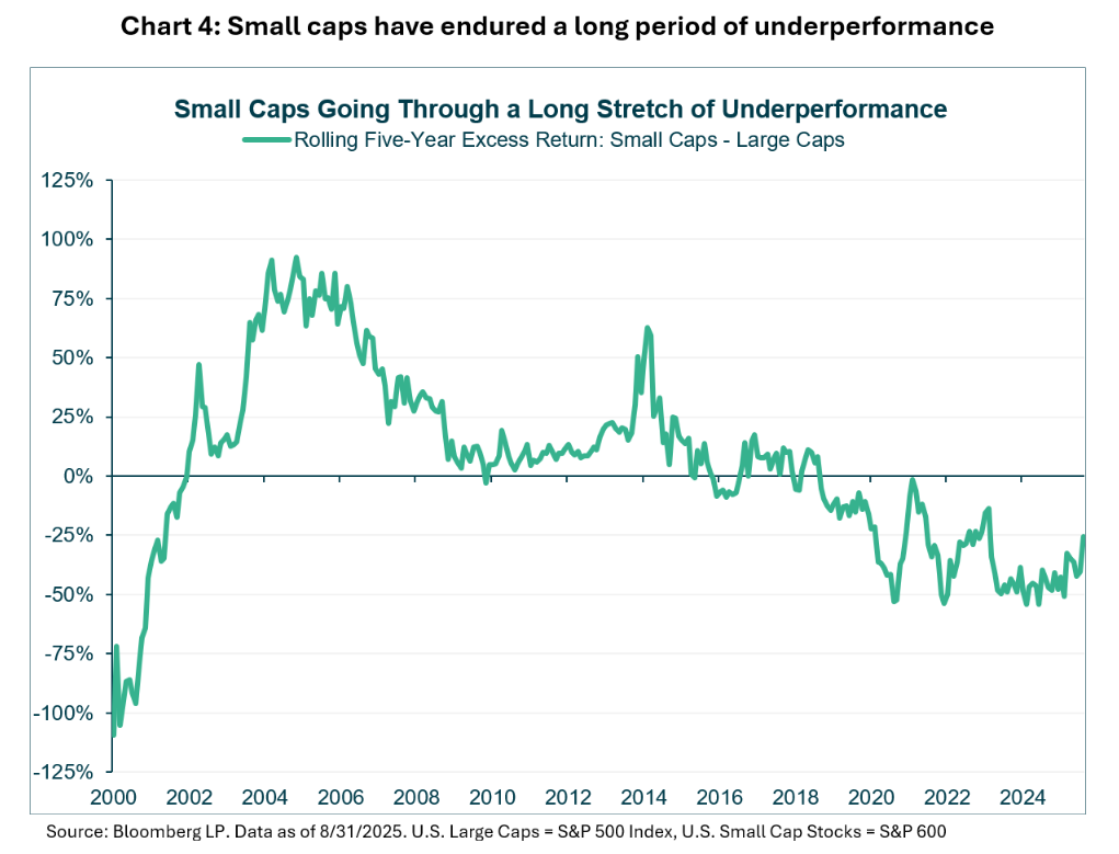 The S&P 600’s year-to-date net total return as of 30 September is approximately 4.2% in USD terms, following gains of 8.7% in 2024 and 16.1% in 2023. However, as chart 4 shows, smaller companies have significantly trailed their larger-cap peers for nearly two decades, a situation that has rarely persisted over longer time periods.