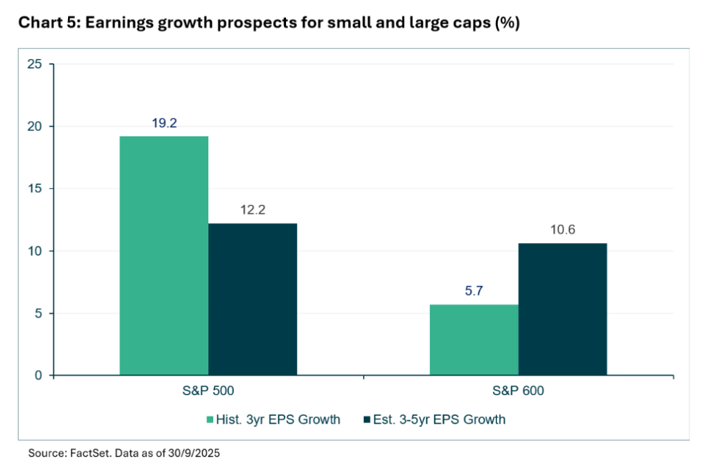 The valuation gap with large caps is striking. The S&P 500’s Price/Earnings ratio has climbed to 27.9 as of 30 September, a significant premium to its 25-year average of 18.6 and approaching dot-com bubble levels. In contrast, the S&P 600’s 15.7 P/E reflects a significant discount to the S&P 500.