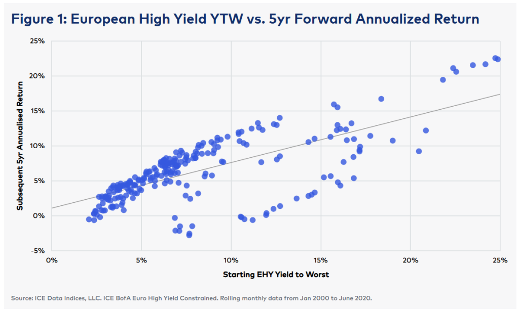 The European High Yield index yield to worst stood at 5.5% as of May 31, 2025 (ICE BofA Euro High Yield Constrained Index), which is 100bp above its 10-year average of 4.5% and equates to a yield of approximately 7.9% once currency hedged into USD. The starting yield to worst has historically shown to be a strong predictor of future returns, as shown in Figure 1, European High Yield YTW vs. 5yr Forward Annualized Return.