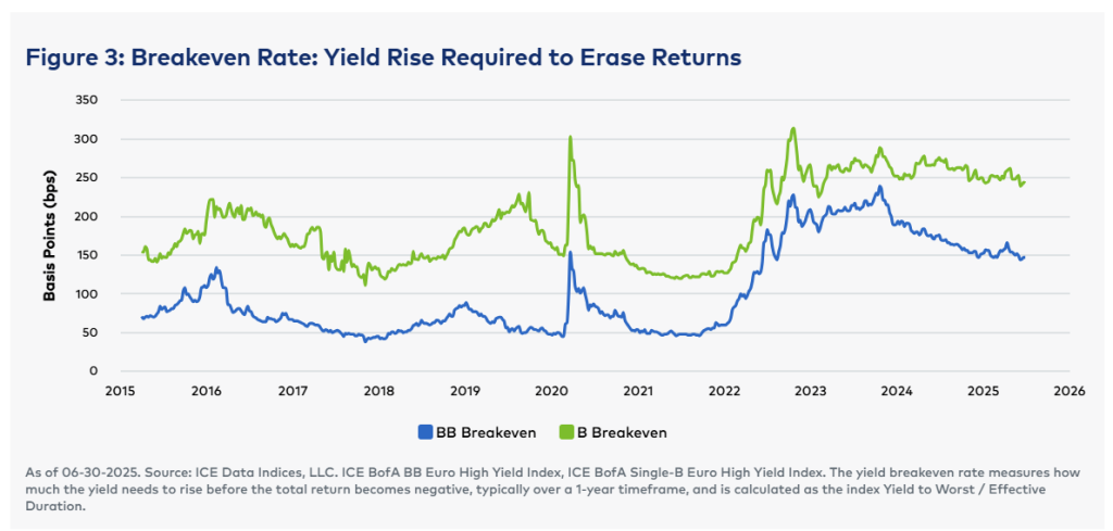 We believe that the European High Yield market offers a compelling risk-return profile for long-term investors. With higher base rates still providing elevated yields, income opportunities are notably improved compared to previous years. The combination of higher yields and low duration also provides a significant cushion to total returns from rising interest rates or spreads. This higher “breakeven rate” is shown below in Figure 3.