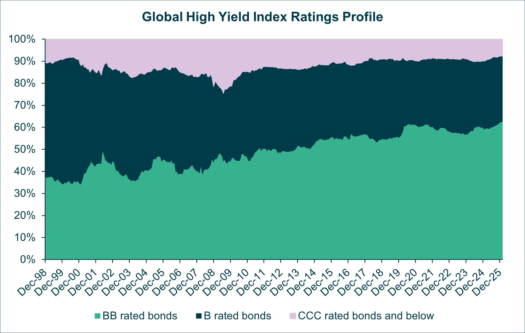 As a result, the overall risk profile of the asset class has evolved.. A market with a higher concentration of BB-rated issuers tends to exhibit lower default risk and more stable behaviour than the “junk” market of the 1990s, acting less like a proxy for equities and more like a hybrid asset class offering income with moderated volatility..