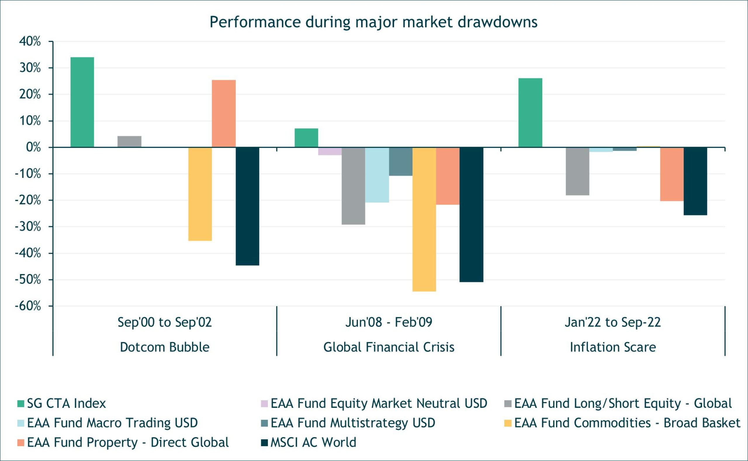 The real damage to portfolios is done during extended drawdowns, where risk assets experience deeper and more persistent declines. Such periods include the bursting of the Dot-Com bubble in 2000, the Great Financial Crisis of 2008, or more recently the Inflation-driven sell-off of 2022.