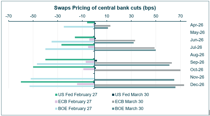 At the same time, markets have dramatically revised their expectations for central bank policy. Investors now anticipate that the Federal Reserve will deliver no rate cuts for the remainder of the year (compared with expectations of two cuts at the end of February). In parallel, both the Bank of England and the European Central Bank are now expected to deliver two interest rate hikes, a notable shift from earlier expectations of easing.