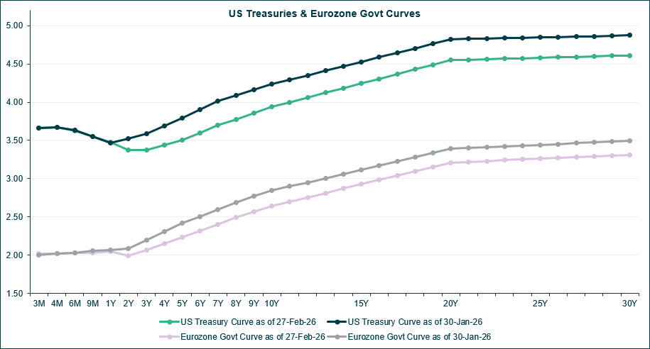 After a quiet start to 2026, interest rates fell in February in both the U.S. and Europe, as declining inflation data increased the likelihood of interest rate cuts in the United States (markets continue to believe the ECB will remain firmly on hold). The falling rates contributed to strong performance over the month, with the Bloomberg U.S. Corporate Total Return Unhedged Index gaining 1.3% in February, and the Bloomberg U.S. Intermediate Credit Index rising 1.0%. European credit underperformed its U.S. counterparts as a result of smaller rate movements within the Eurozone, with the Bloomberg Euro Aggregate Corporate Total Return Index returning 0.6% in EUR terms in February.
