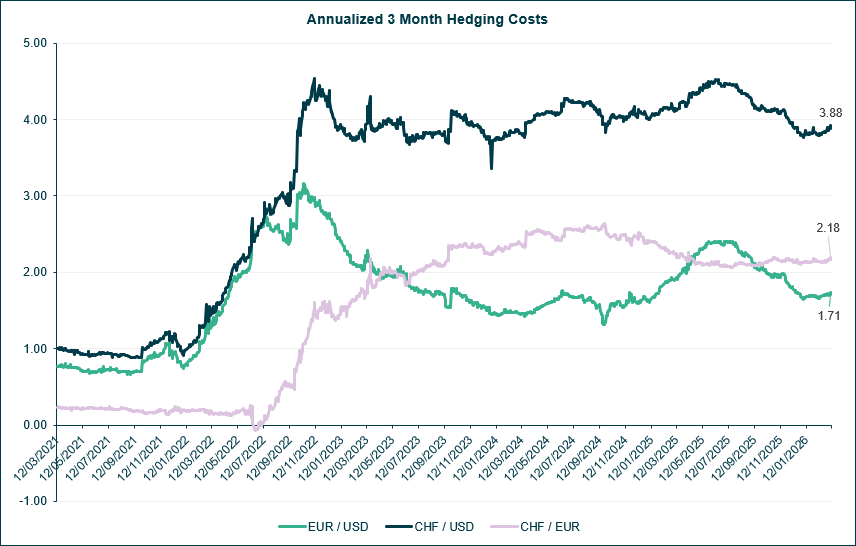 Hedging rates from USD into euros and Swiss francs were stable throughout February but have crept up month-to-date in March, due to the impact of the spike in oil prices on future inflation expectations. Despite the renewed conflict in the Persian Gulf, markets continue to predict that the U.S. Federal Reserve will keep cutting rates throughout 2026, while the ECB is currently forecast to remain on hold. This narrowing of interest rate differentials between the U.S. and Europe/Switzerland should result in a fall in hedging rates, making USD-denominated investments more attractive for euro- and franc-based clients.