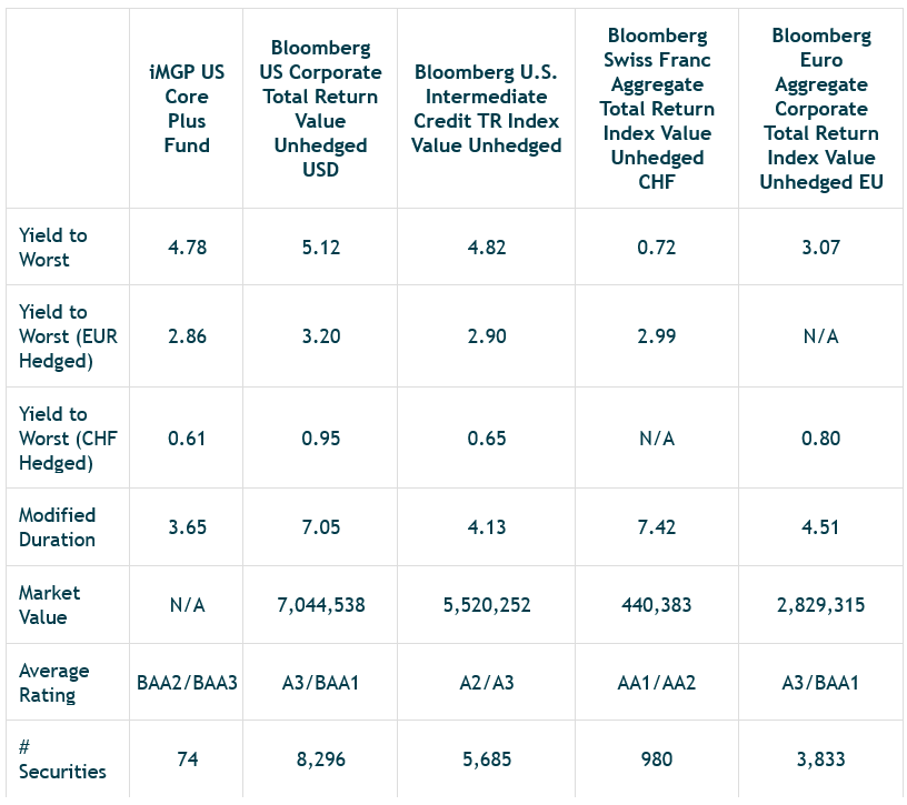 The iMGP US Core Plus Fund continues to be positioned cautiously; however, careful selection of credit has allowed the portfolio to produce yields at similar levels to longer-duration benchmark indices. We believe that U.S. intermediate-term credit currently offers a compelling absolute level of yield, particularly relative to pre-pandemic averages. For European investors, the additional benefit of declining hedging rates further enhances the potential attractiveness of this asset class, which offers both diversification opportunities and appealing yield levels. Looking ahead to 2026, the fundamentals supporting the strategy remain attractive, underpinned by strong corporate earnings, robust investor demand, and the anticipated easing from the U.S. Federal Reserve.