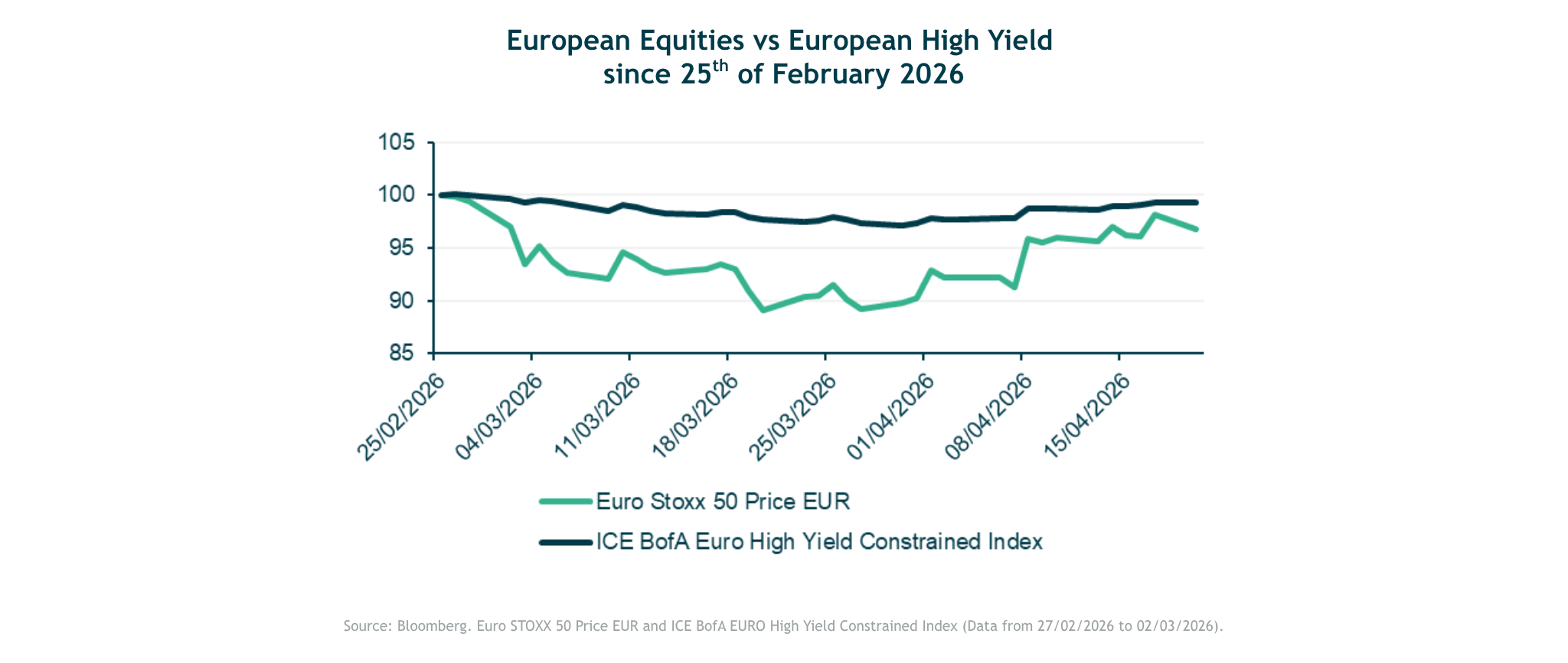Recent market episodes highlight this evolution. During the 2025 “Liberation Day” drawdown, European equities fell by more than 13% peak-to-trough, while European high yield declined by only around 2.4%. A similar pattern emerged in early 2026, with equities down over 9% versus a modest 2% move in high yield.