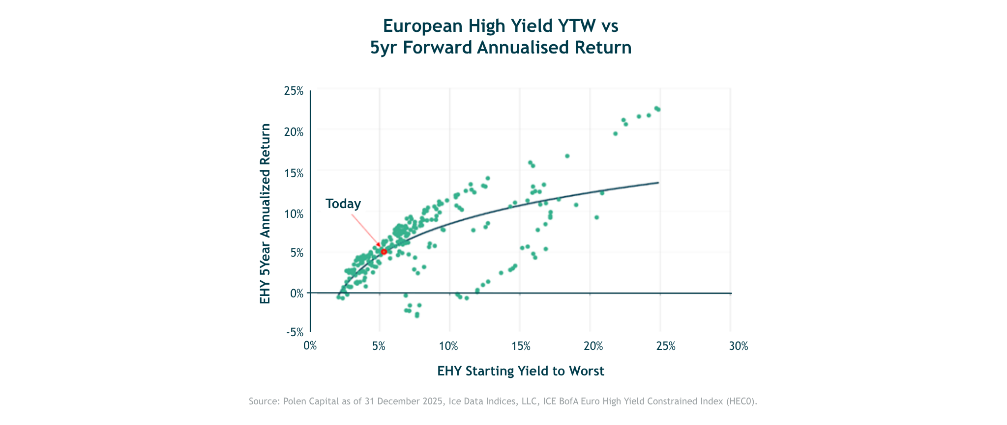 Starting yield has historically been one of the most reliable predictors of long-term returns in high yield markets. When investors enter at higher yield levels, subsequent five-year returns have typically been stronger.