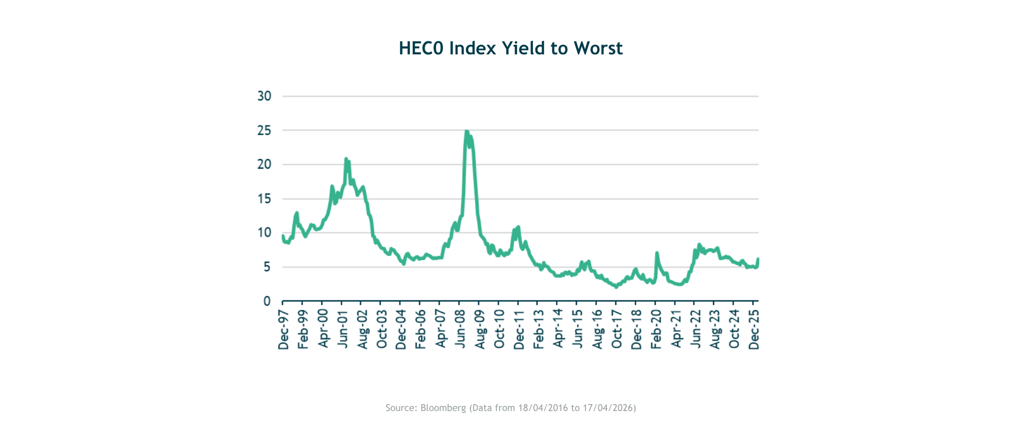 Today, yields remain compelling. The European high yield index offers levels close to the mid-5% range—around 100 basis points above its 10-year average. For active managers able to selectively allocate to single-B bonds while controlling risk, portfolio yields can reach the mid-6% range.