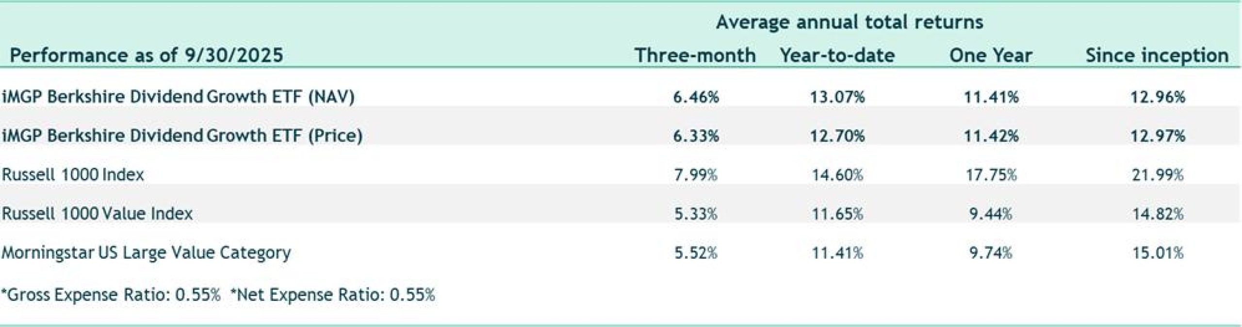 The iMGP Berkshire Dividend Growth ETF Fund returned 6.46% (NAV return) & 6.33% (Market Return) in the third quarter compared to 5.33% for the Russell 1000 Value Index. The Morningstar U.S. Large Value category had a return of 5.52% over the same period.