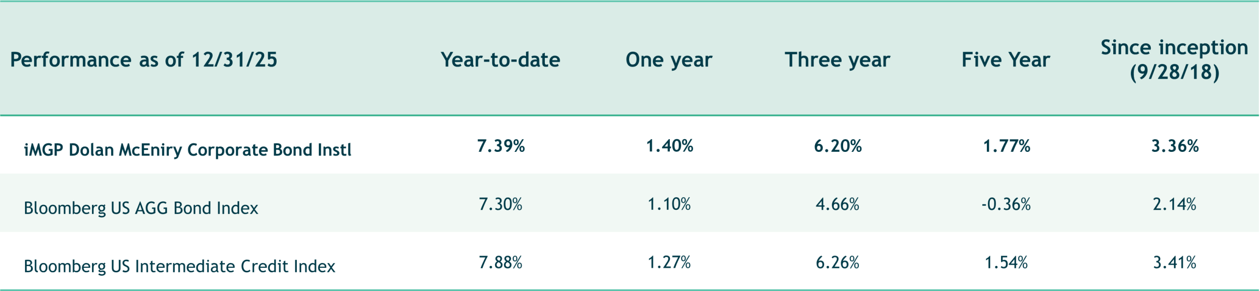 | Performance: | iM Dolan McEniry Corporate Bond Fund | Bloomberg U.S. Intermediate Credit | |